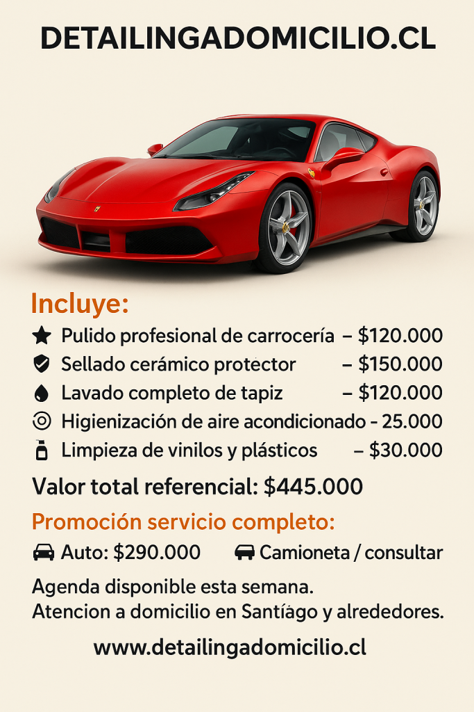 Ofrecemos un servicio profesional de sellado cerámico de autos en Santiago, ideal para quienes buscan proteger la pintura de su vehículo y mantener un acabado brillante por mucho más tiempo. Vamos directamente a tu domicilio, con equipos y productos de nivel profesional.